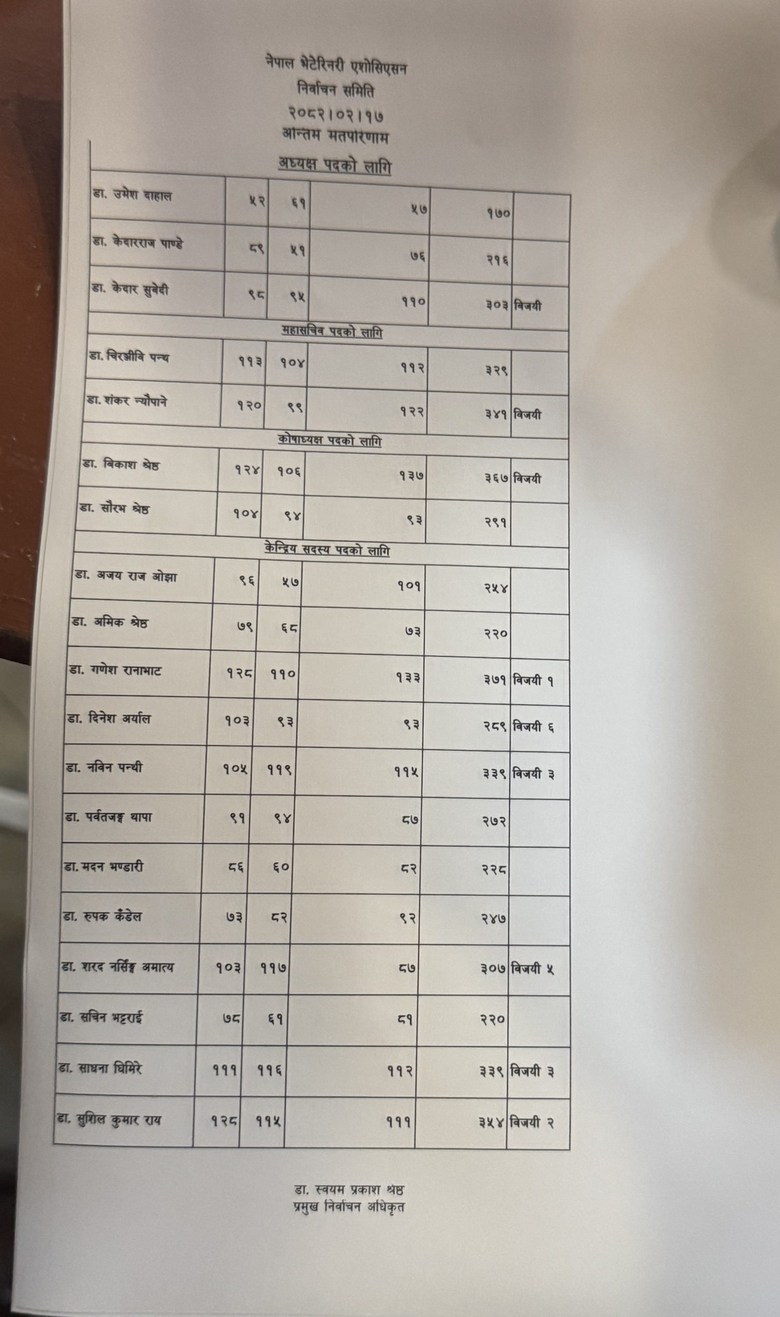 अन्य पदमा निर्वाचित हुनेहरूमा महासचिवमा डा. शंकर न्यौपाने ३४१ मत र कोषाध्यक्षमा डा. विकास श्रेष्ठ ३६७ मतरहेको छ।