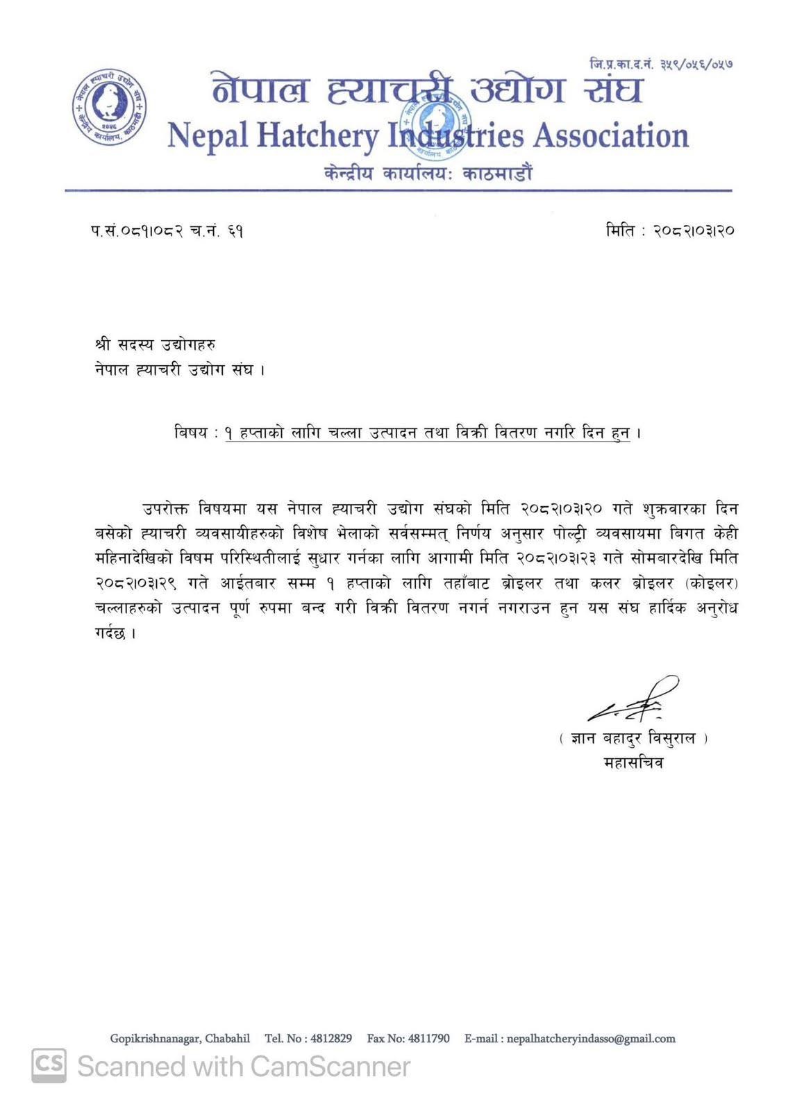 संघले आगामी असार २३ गते सोमबारदेखि असार २९ गते आइतबारसम्म सम्पूर्ण ह्याचरी व्यवसायीहरूलाई चल्ला उत्पादन तथा बिक्री वितरण नगर्न अपिल गरेको हो।