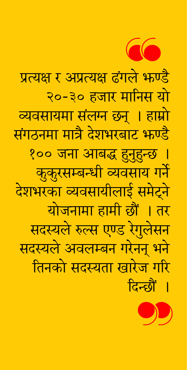 प्रत्यक्ष र अप्रत्यक्ष ढंगले झण्डै २०–३० हजार मानिस यो व्यवसायमा संलग्न छन् । हाम्रो संगठनमा मात्रै देशभरबाट झण्डै १०० जना आबद्ध हुनुहुन्छ । कुकुरसम्बन्धी व्यवसाय गर्ने देशभरका व्यवसायीलाई समेट्ने योजनामा हामी छौं । तर सदस्यले रुल्स एण्ड रेगुलेसन सदस्यले अवलम्बन गरेनन् भने तिनको सदस्यता खारेज गरिदिन्छौं । कुकुरको बच्चालाई व्यवस्थित नगरी फ्याँकिदिएकाको हामीले यसअघि सदस्यता खारेज गरिसकेका छौं । संघको नियम पालना हुँदैन उनीहरूलाई समेटेर काम पनि हुँदैन नि ।