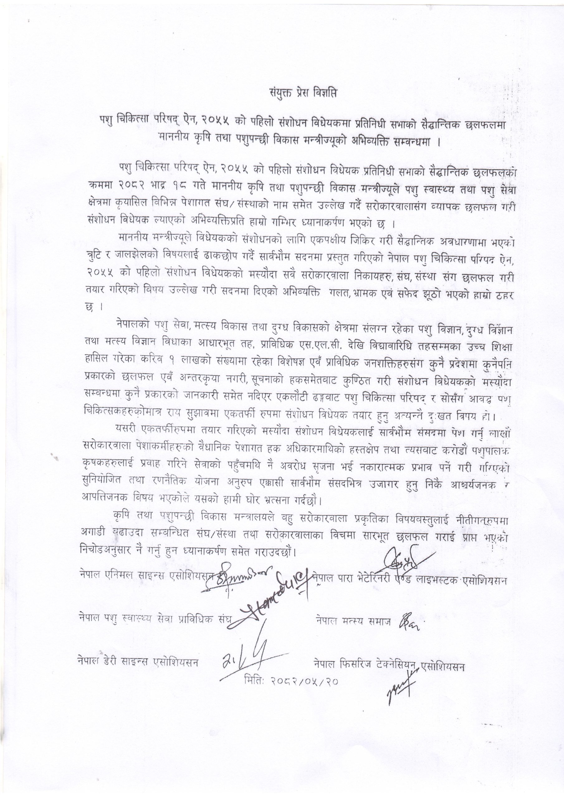 नेपाल एनिमल साइन्स एसोशिएसन, नेपाल पारा भेटेरिनरी एण्ड लाइभस्टक एसोशिएसन, नेपाल पशु स्वास्थ्य सेवा प्राविधिक संघ, नेपाल मत्स्य समाज, नेपाल डेरी साइन्स एसोसिएसन र नेपाल फिसरिज टेक्नेसिएन एसोसिएसनद्वारा शुक्रबार जारी संयुक्त विज्ञप्तिमा पशु चिकित्सा परिषद् ऐन, २०५५ को पहिलो संशोधन विधेयक पशु स्वास्थ्य तथा पशु सेवा क्षेत्रमा क्रियाशील सरोकारवालासँग व्यापक छलफल गरी ल्याएको भनेर प्रतिनिधिसभामा मन्त्रीले राखेको धारणा पूर्णतः गलत र भ्रामक भएको उल्लेख छ ।