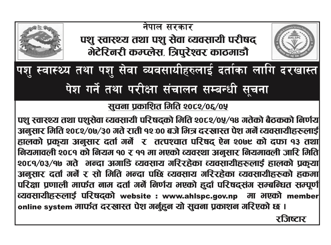दर्ता गर्न इच्छुक व्यवसायीहरूले परिषद्को आधिकारिक वेबसाइट www.ahlspc.gov.np मा उपलब्ध member online system मार्फत दरखास्त पेश गर्नुपर्नेछ। परिषद्ले तोकिएको समयसीमाभित्र दर्ता नगरे व्यवसाय सञ्चालन गर्न कठिनाइ हुने चेतावनी दिँदै सम्बन्धित सबैलाई शीघ्र दर्ता प्रक्रियामा सहभागी हुन आग्रह गरेको छ।