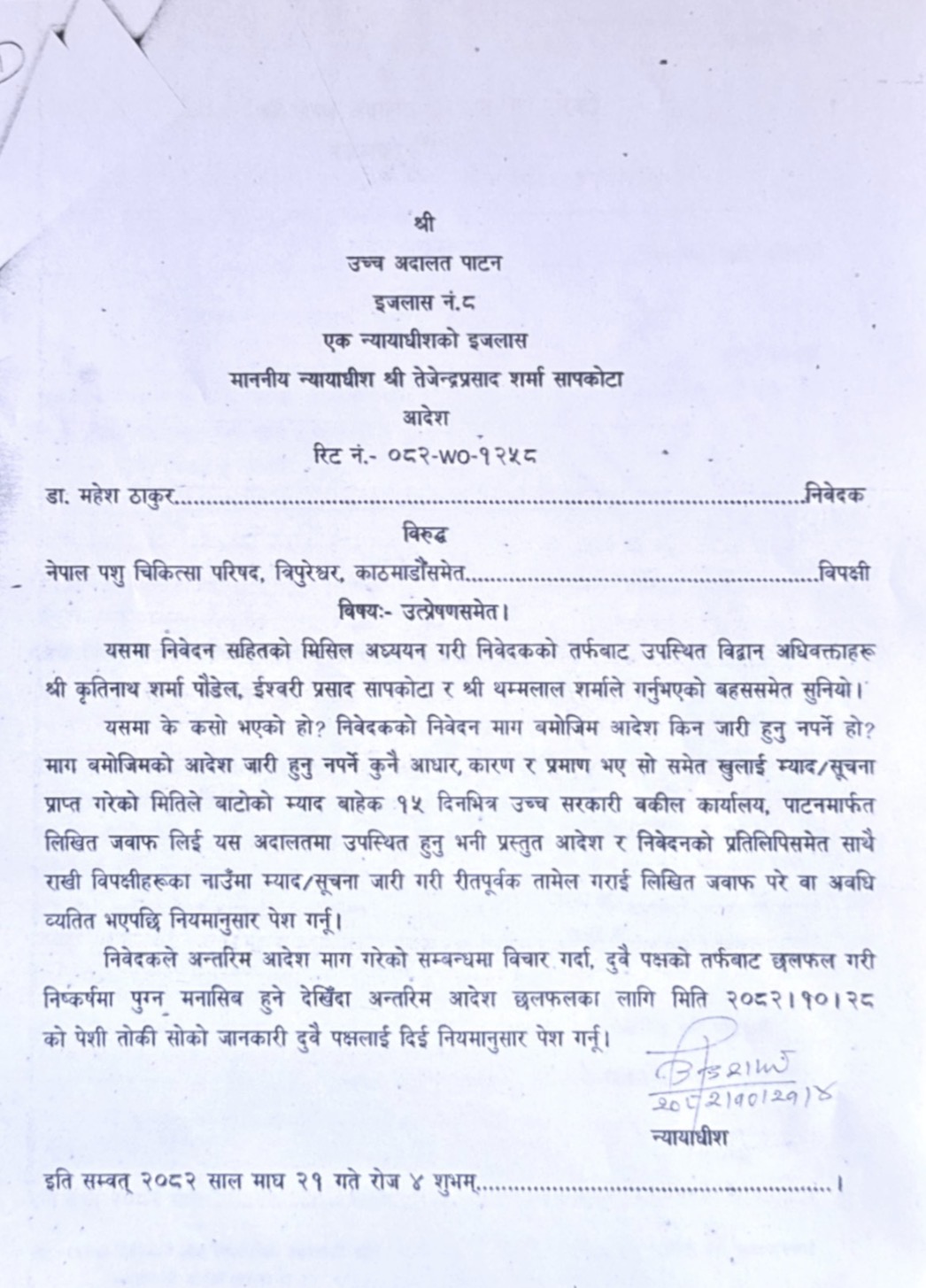 पशु चिकित्सकको नाम दर्ता परीक्षा रोक्ने माग उच्च अदालतमा, माघ २८ मा छलफल