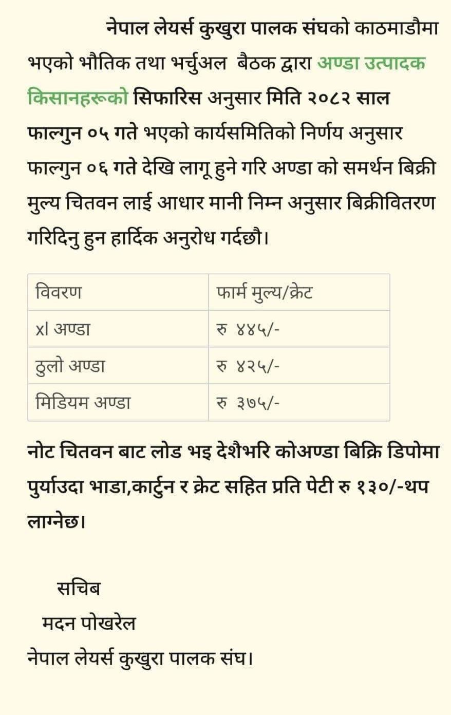 संघका अनुसार ठूलो (XL) अण्डाको फार्म मूल्य प्रतिक्रेट रु ४४५, ठूलो अण्डाको रु ४२५ र मिडियम अण्डाको रु ३७५ निर्धारण गरिएको छ। नयाँ मूल्य आजदेखि लागू हुने जनाइएको छ।