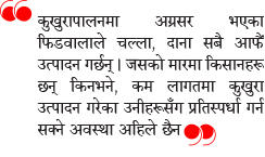 कुखुराको लागत मूल्य निकै बढी छ । पहिलो त हामीले चल्ला नै महँगोमा खरिद गरेर पाल्नु पर्छ । खोरमा हालेको सबै चल्ला बाँच्दा पनि बाँच्दैनन् । कतिपय बीचमै मर्छन् । दाना पनि महँगो छ । कुखुरापालनमा अग्रसर भएका फिडवालाले चल्ला, दाना सबै आफैं उत्पादन गर्छन् । जसको मारमा किसानहरू छन् किनभने, कम लागतमा कुखुरा उत्पादन गरेका उनीहरूसँग प्रतिस्पर्धा गर्न सक्ने अवस्था अहिले छैन । बजारमा उनीहरूको करिब एकाधिकार जस्तै छ । हाम्रो कुखुरा बिक्री गर्ने बेला मितलेमतो र चलखेलमा बजारमा भाउ पनि घटाइन्छ ।