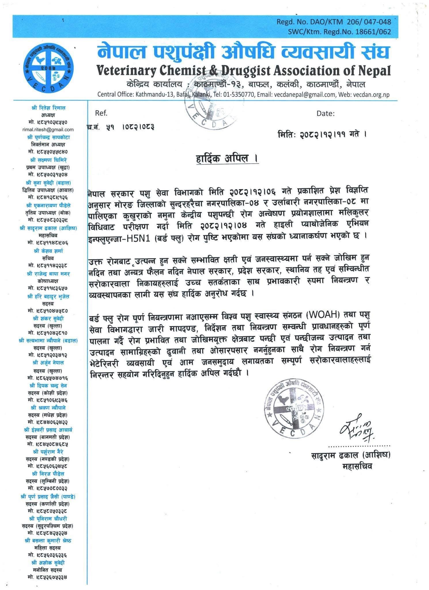 बर्डफ्लु नियन्त्रणमा कडाइ गर्न औषधि व्यवसायी संघको अपिल