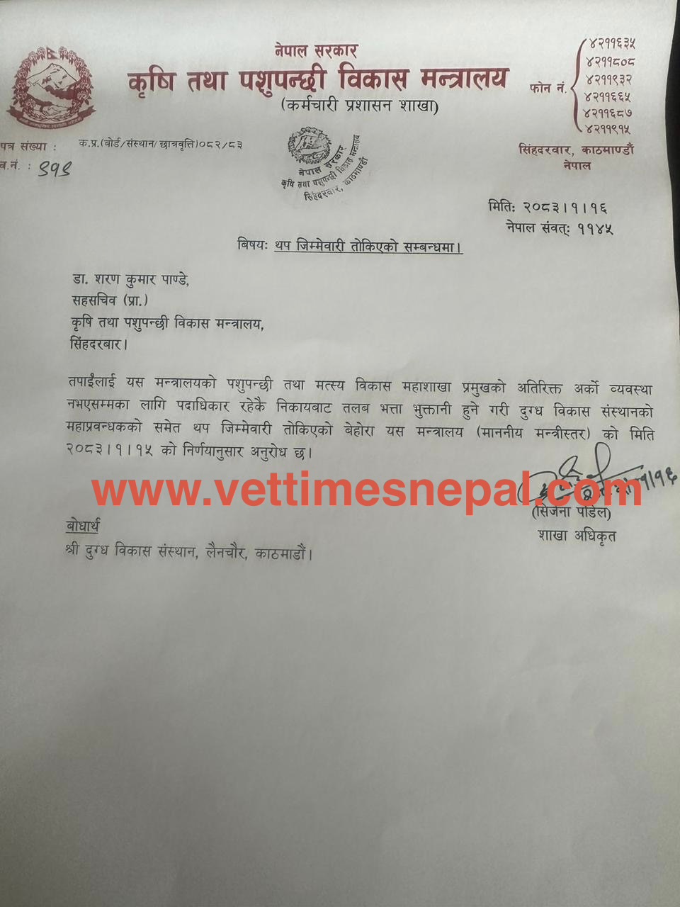 काठमाडौँ । कृषि तथा पशुपन्छी विकास मन्त्रालयले सहसचिव डा. शरणकुमार पाण्डेलाई दुग्ध विकास संस्थान (डीडीसी) को महाप्रबन्धकको जिम्मेवारी प्रदान गरेको छ। मन्त्रीस्तरीय निर्णयअनुसार उनलाई अर्को व्यवस्था नभएसम्मका लागि संस्थानको नेतृत्व सम्हाल्ने जिम्मेवारी दिइएको हो।
