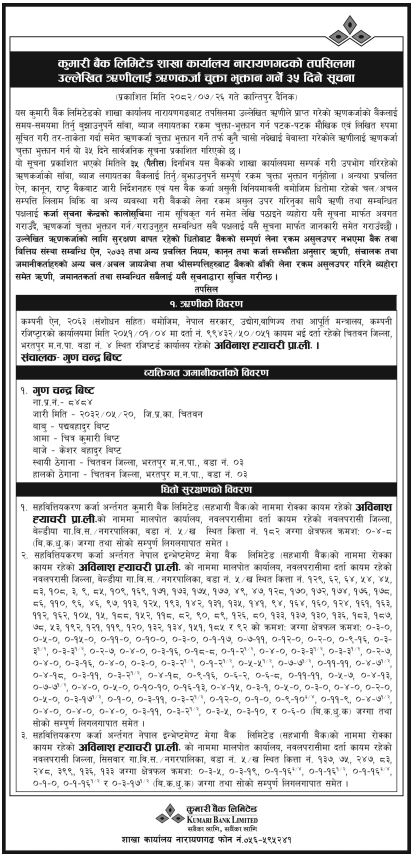 कुमारी बैंकले कार्तिक २६ कान्तिपुर राष्ट्रिय दैनिकमा ३५ दिने सार्वजनिक सूचना प्रकाशित गरेको हो। अविनाश ह्याचरीले कुमारी बैंकको नारायणगढ शाखाबाट ऋण लिएको थियो। बैंकका अनुसार, ऋणीलाई पटक–पटक मौखिक र लिखित रूपमा ऋण र ब्याज चुक्ता गर्न सूचना दिइए पनि उनीहरूले चासो देखाएका छैनन्।