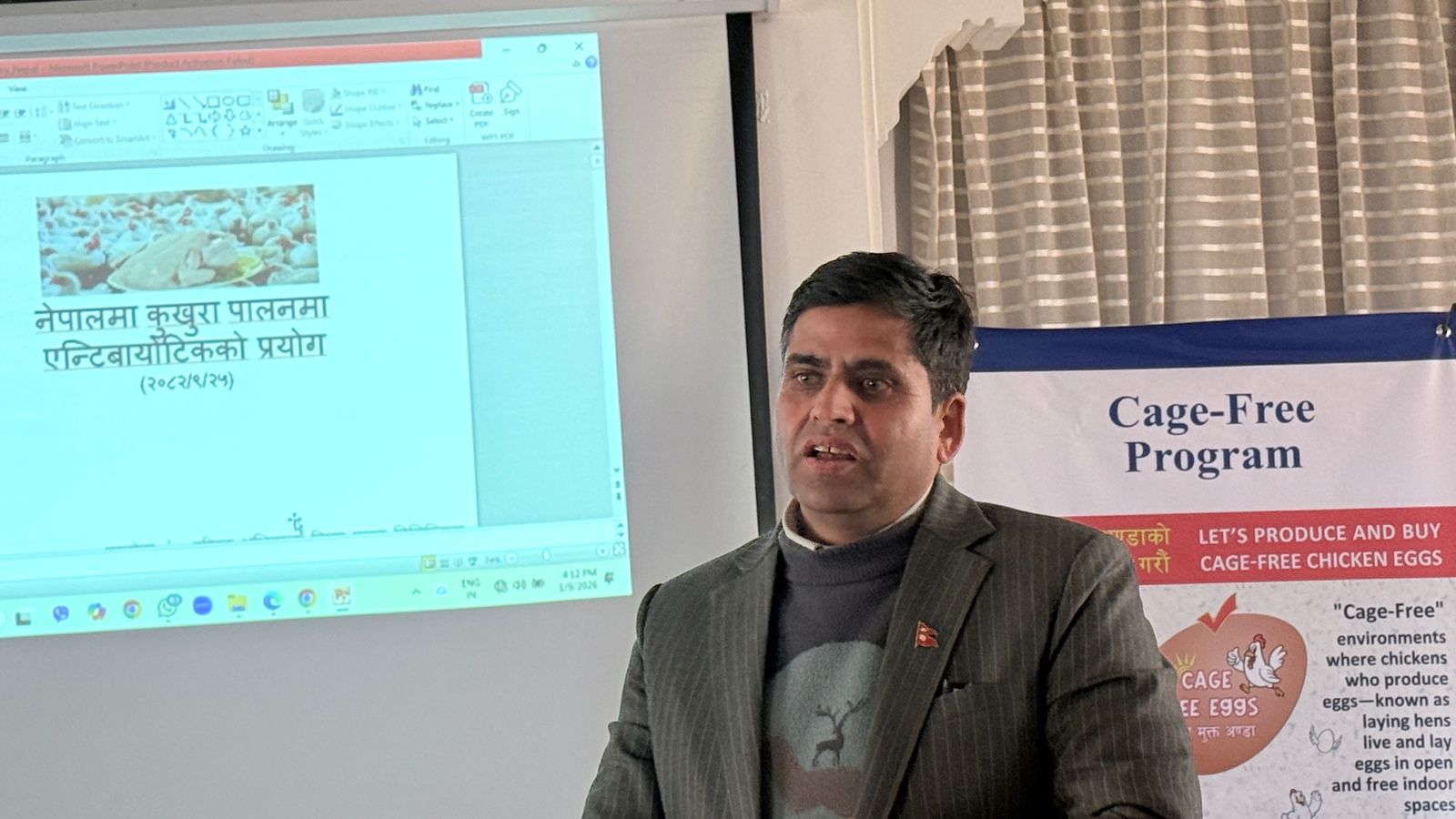 महानिर्देशक डा. उमेश दाहालले मन्त्रालयले तयार पारेको एन्टिमाइक्रोबियल प्रयोगसम्बन्धी गाइडलाइन अन्तिम चरणमा पुगेको जानकारी दिँदै, जनचेतना अभिवृद्धि र एन्टिबायोटिकका विकल्प प्रवद्र्धनमा विभागले सक्रिय भूमिका खेलेको बताए। उनले अण्डामा कम्तीमा उत्पादन मिति र उत्पादन स्थल खुल्ने गरी लेबलिङ अनिवार्य गर्नुपर्ने, गलत अभ्यास गर्नेहरूलाई कडाइका साथ कारबाही गर्नुपर्ने, र यस दिशामा सबैको सहभागिता अपरिहार्य रहेको पनि स्पष्ट पारे। यद्यपि औषधिको नियमन गर्ने मुख्य जिम्मेवारी औषधि व्यवस्था विभागको भए पनि सहकार्य गरेर अगाडि बढ्ने बताएका छन्।